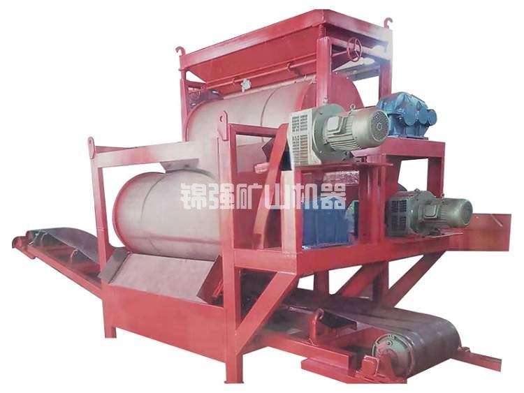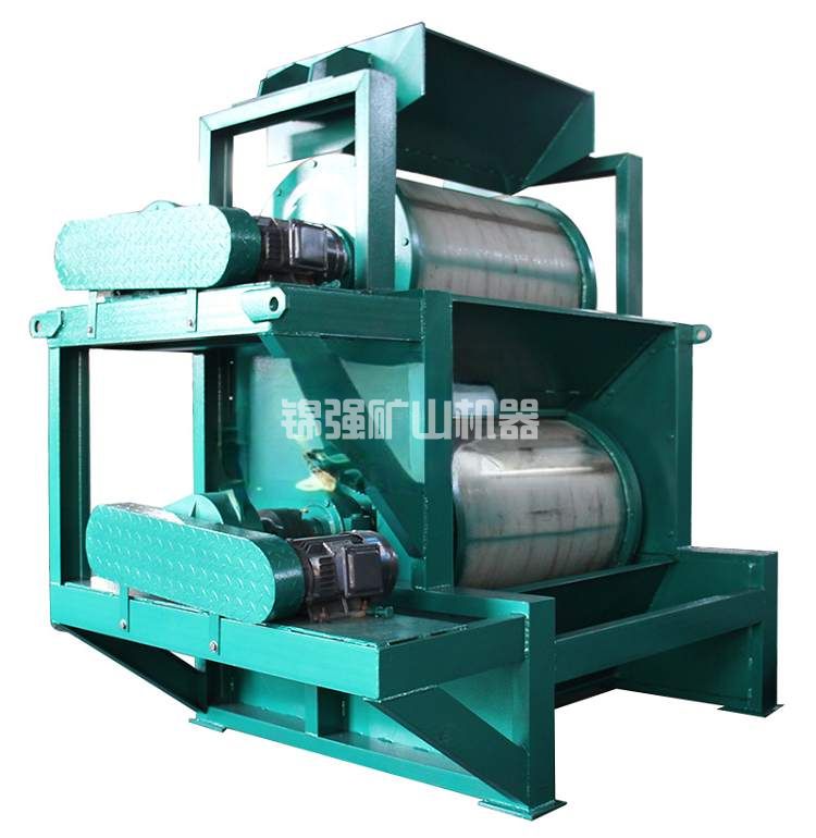 含有磁性物質(zhì)的非磁性物料經(jīng)過電磁振動給料機均勻的分布到強磁雙輥干式磁選機皮帶上;當物料通過強磁輥時,磁性物質(zhì)由于受磁力的吸附作用被吸附到強磁輥上,被皮帶帶入磁性物料集料斗中;非磁性物料及未被選凈的磁性物料隨著皮帶的轉(zhuǎn)動受重力作用,脫離磁場并下落到下一層皮帶上繼續(xù)選別;這樣,經(jīng)過幾道磁選之后就能選別出合格產(chǎn)品。